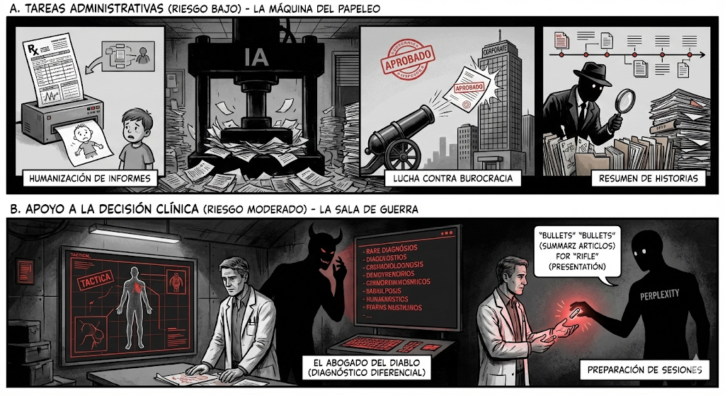 El "Abogado del Diablo" (Diagnóstico Diferencial): Ante un caso difícil, presente los síntomas y pida: "Dame 5 diagnósticos diferenciales probables y 3 diagnósticos raros pero graves que no debería pasar por alto. Justifica cada uno." Esto ayuda a romper el sesgo de cierre prematuro.