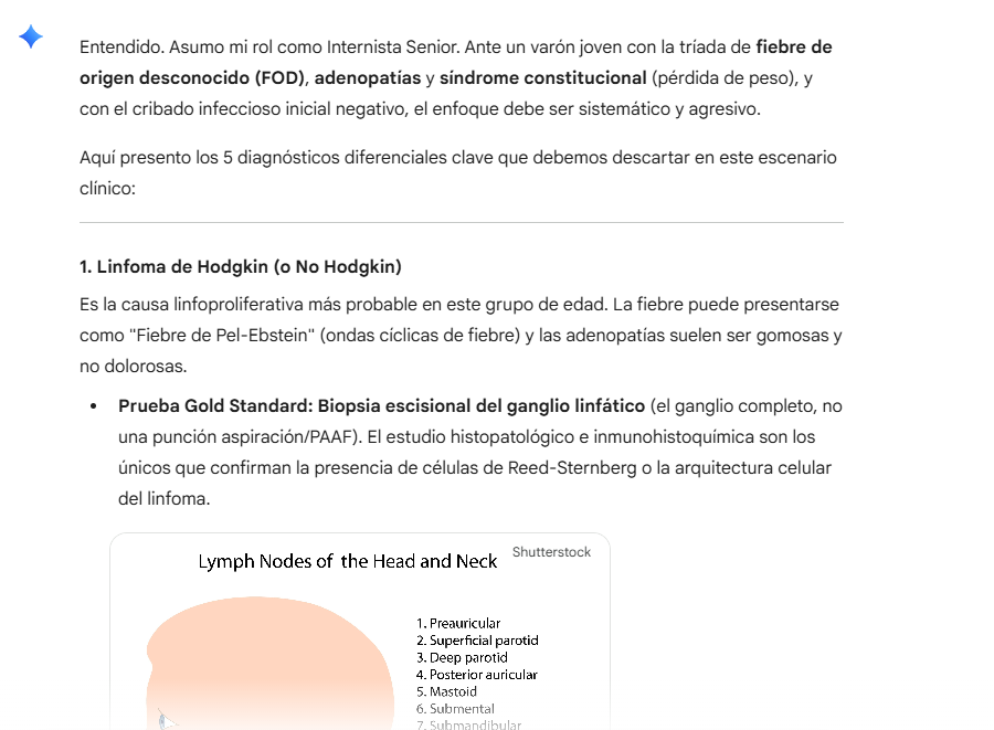 "Actúa como un Internista Senior. Presento el caso de un varón de 40 años con fiebre recurrente, adenopatías y pérdida de peso, con serología infecciosa negativa (Paciente A). Genera una lista de 5 posibles diagnósticos diferenciales (incluyendo autoinmunes y linfoproliferativos). Para cada uno, sugiere la prueba 'Gold Standard' para confirmarlo o descartarlo."