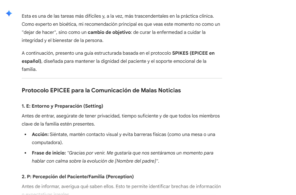 "Actúa como experto en bioética y comunicación. Tengo que informar a una familia que el tratamiento oncológico de su padre ya no es efectivo y debemos pasar a cuidados paliativos. Escribe un guion de conversación estructurado (protocolo SPIKES/EPICEE) con frases sugeridas para abordar el tema con máxima sensibilidad."