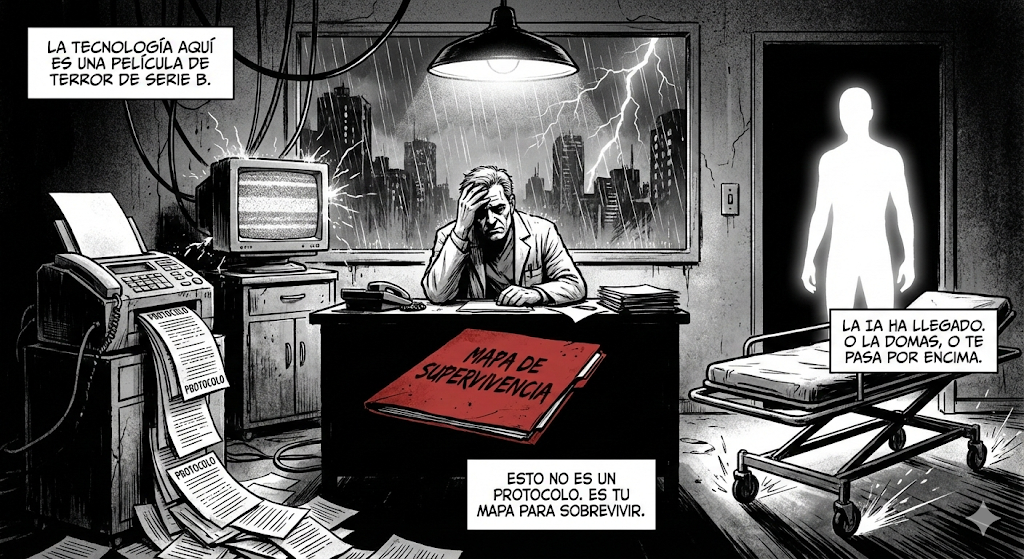 Seamos claros: la tecnología en el hospital suele estar a medio camino entre un fax de 1990 y una película de terror de serie B. O no funciona, o funciona cuando no debe. Pero la IA ha llegado, y aunque ahora mismo te suene a ciencia ficción o a capricho de la gerencia, tienes dos opciones: domarla o dejar que te pase por encima como una camilla sin frenos.