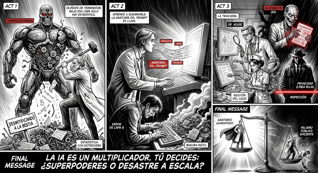 Ten clara una cosa antes de pasar página: la Inteligencia Artificial es un multiplicador, no un milagro. Si eres un buen profesional, esta herramienta te regalará tiempo y superpoderes; pero si eres un incompetente, la IA solo servirá para que cometas errores garrafales a una velocidad y escala nunca antes vistas. Tú decides si quieres ser un sanitario "aumentado" o simplemente convertirte en un peligro público mucho más eficiente.