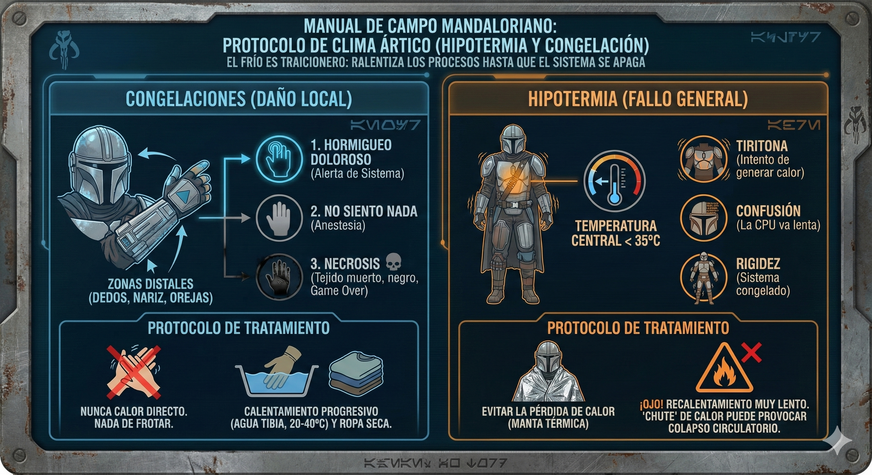 Congelaciones (Daño local): Zonas distales (dedos, nariz, orejas). Pasan de "hormigueo doloroso" a "no siento nada" y finalmente a necrosis (tejido muerto, negro, game over para esa parte).