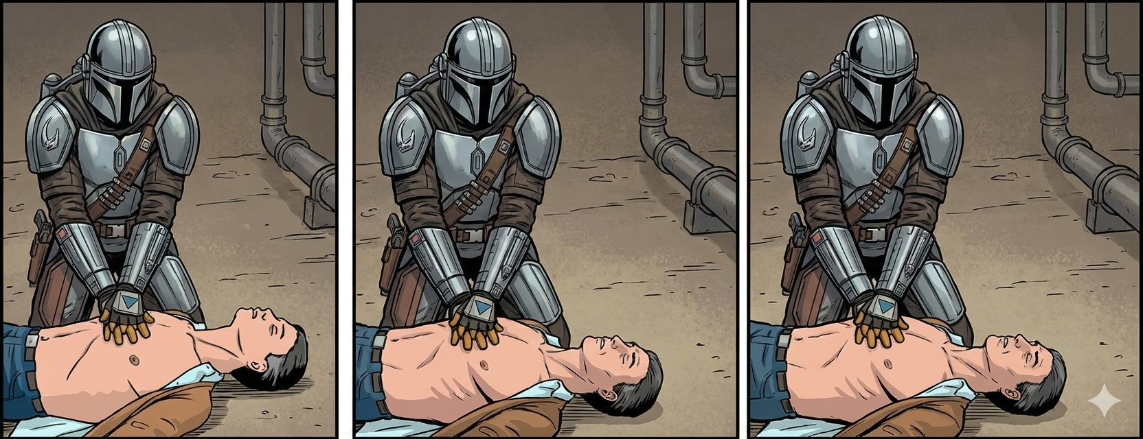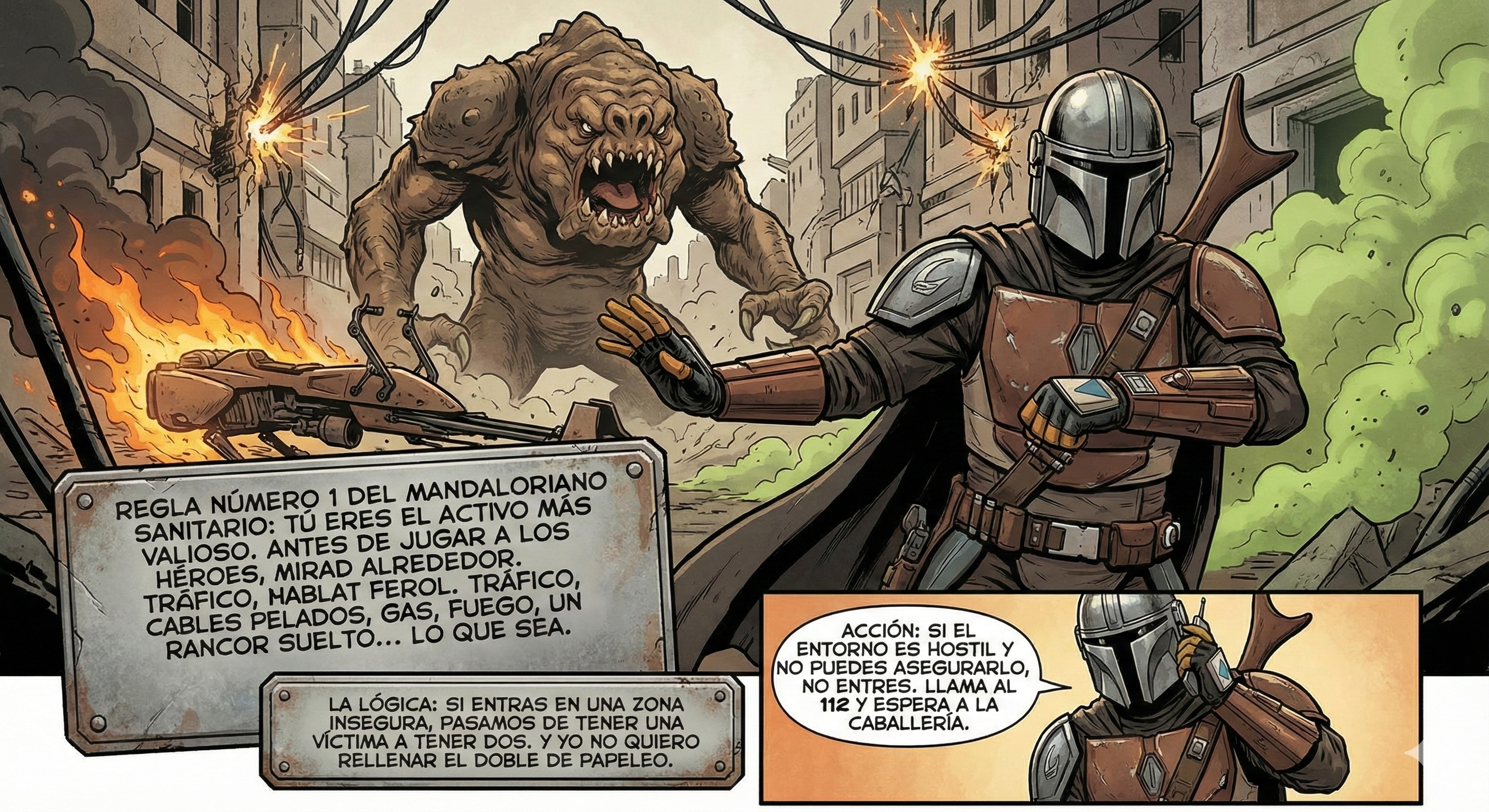 Regla número 1 del Mandaloriano Sanitario: Tú eres el activo más valioso. Antes de jugar a los héroes, mirad alrededor. Tráfico, cables pelados, gas, fuego, un Rancor suelto... lo que sea.