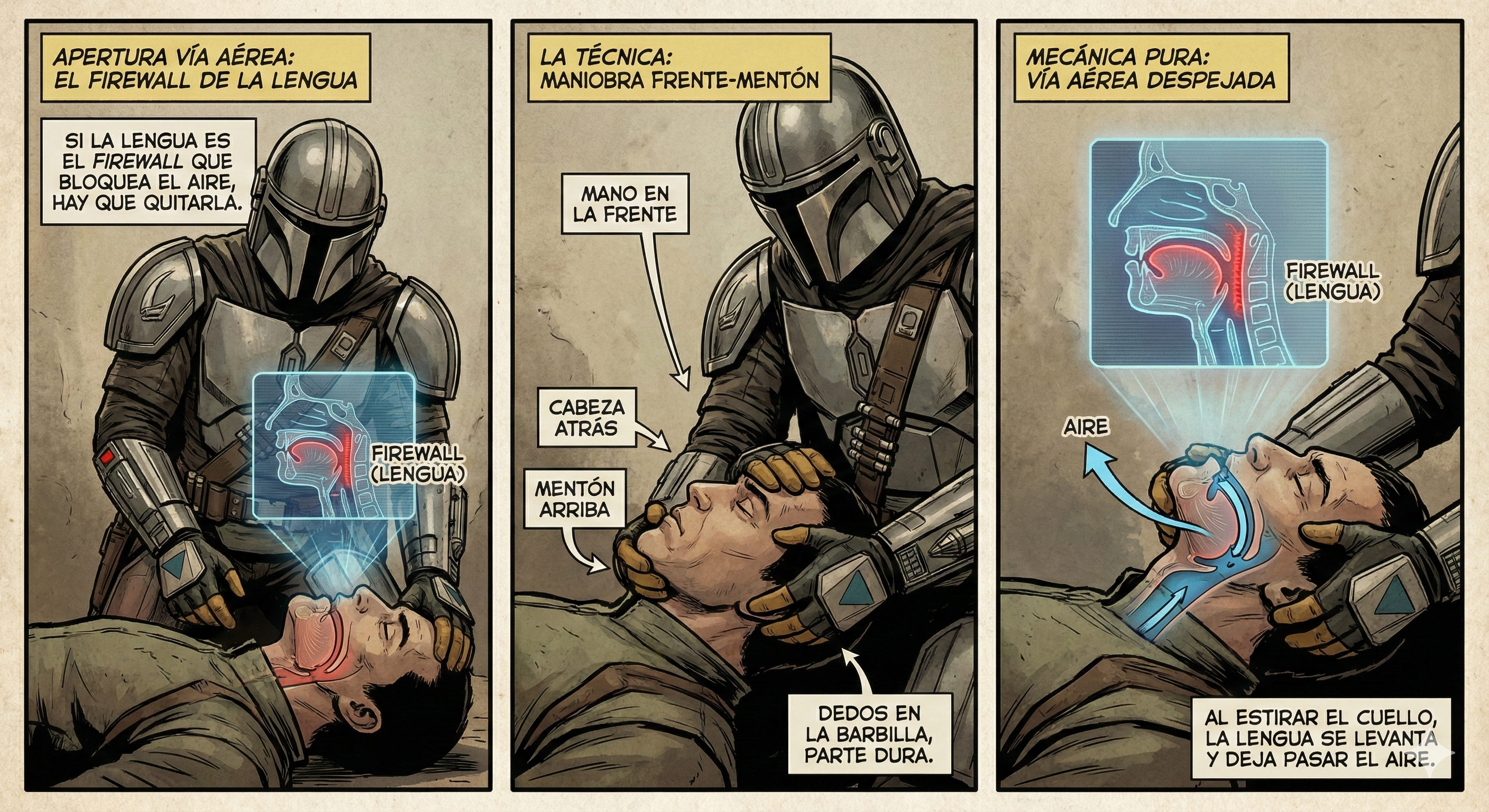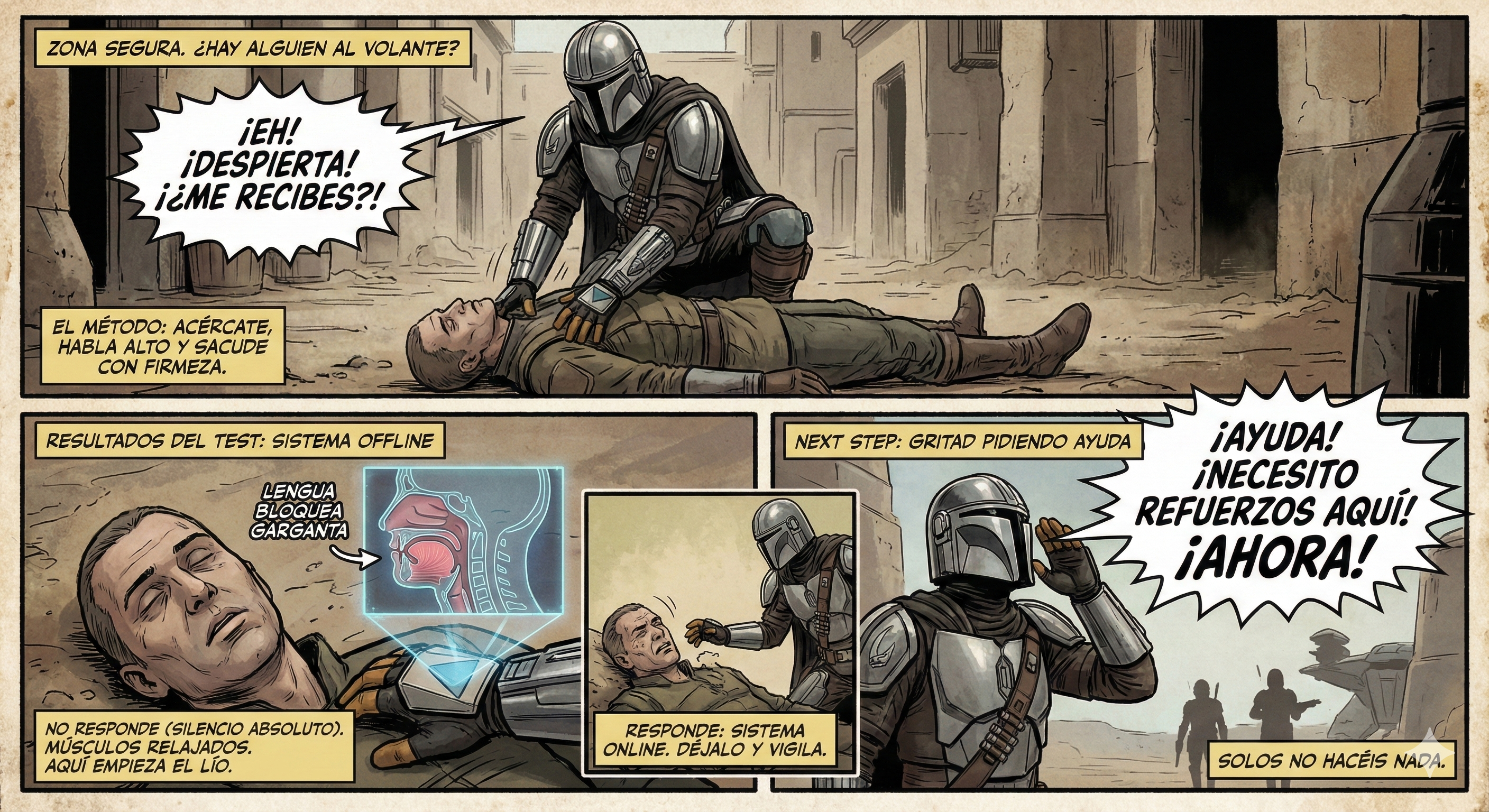 No responde (Silencio absoluto): Sistema Offline (Inconsciente). Aquí empieza el lío. Al perder la consciencia, los músculos se relajan. La lengua (que es un músculo vago) cae hacia atrás y tapa la garganta.Next Step: Gritad pidiendo ayuda. Solos no hacéis nada.