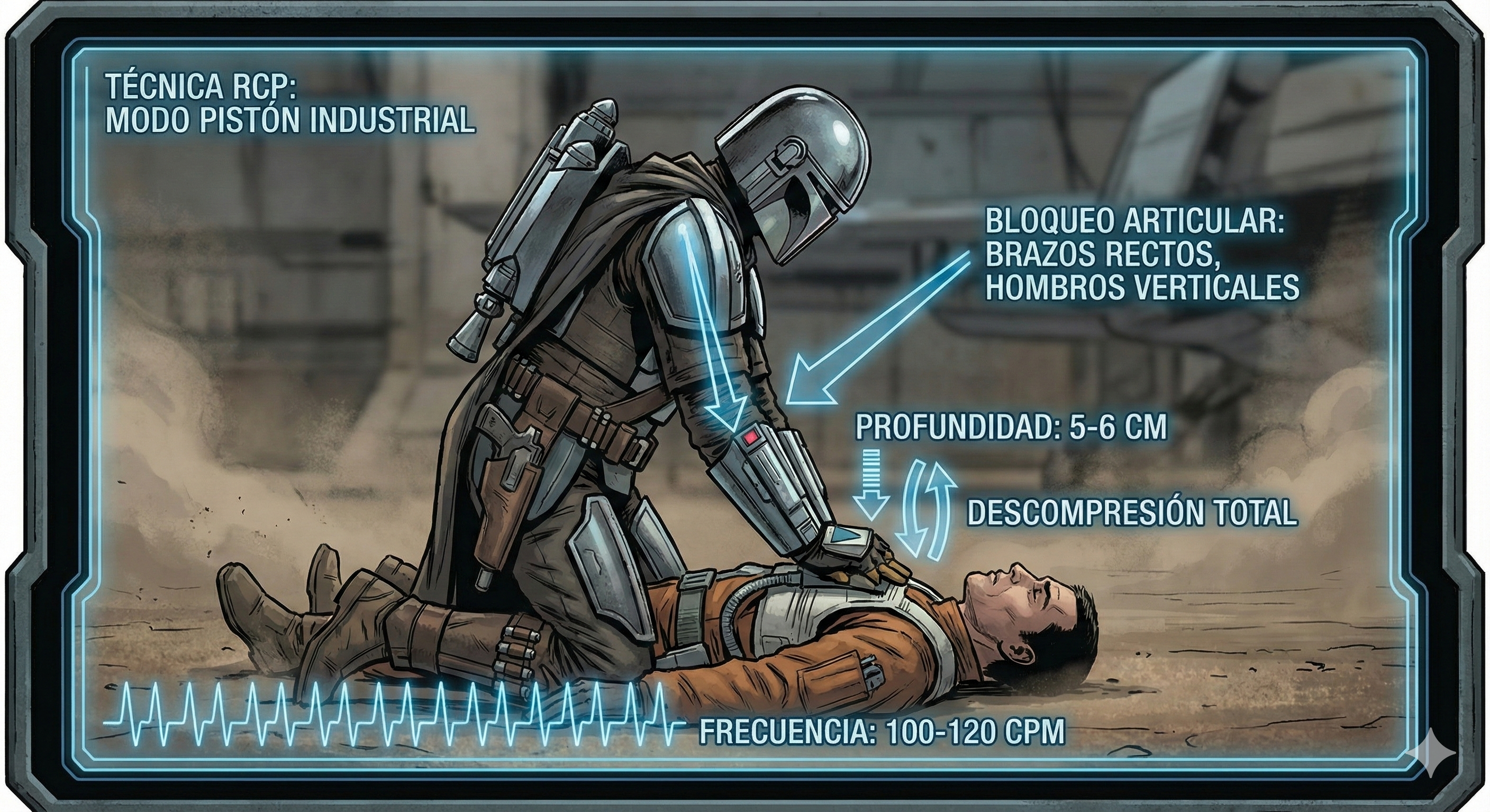Olvidad lo que veis en las películas donde el actor dobla los codos y le da masajitos suaves al pecho mientras llora. Eso no mueve sangre. Para mover el fluido hidráulico (sangre) contra la gravedad y la resistencia vascular, necesitáis convertiros en un pistón industrial.