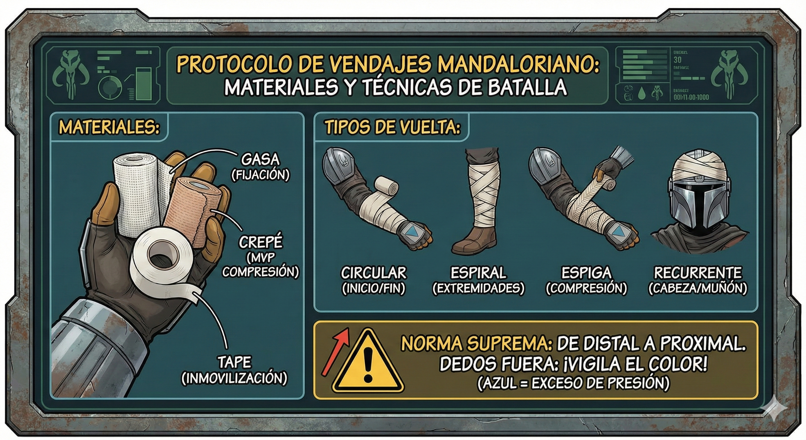 Norma suprema: Siempre de distal (lejos del corazón) a proximal (hacia el corazón). Y dejad los dedos fuera para ver si se ponen morados (signo de que te has pasado apretando).
